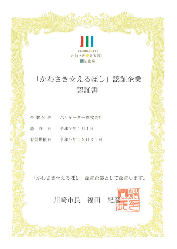 中小企業として、川崎市より「かわさき☆えるぼし」認証を受けました。